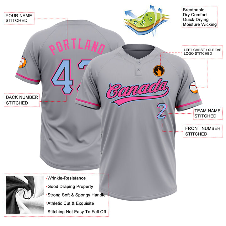 Custom Gray Light Blue Black-Pink Two-Button Unisex Softball Jersey