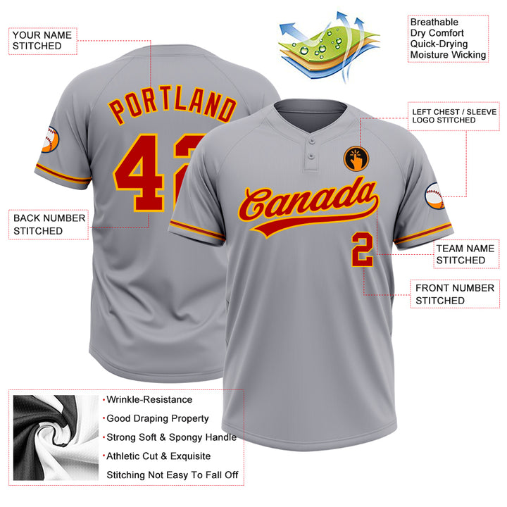 Custom Gray Red-Gold Two-Button Unisex Softball Jersey