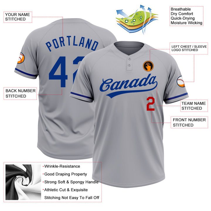 Custom Gray Royal-Red Two-Button Unisex Softball Jersey