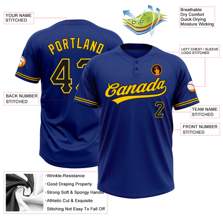 Custom Royal Black-Yellow Two-Button Unisex Softball Jersey