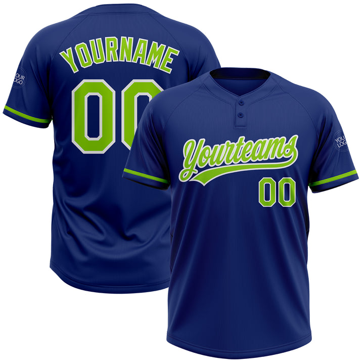 Custom Royal Neon Green-White Two-Button Unisex Softball Jersey